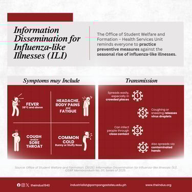 With the seasonal rise of Influenza-Like Illnesses (ILI), Pampanga State University, through the memorandum given by the Office of Student Welfare and Formation, as well as the Occupational Safety and Health Office, enforces the mandatory wearing of face masks starting October 16.