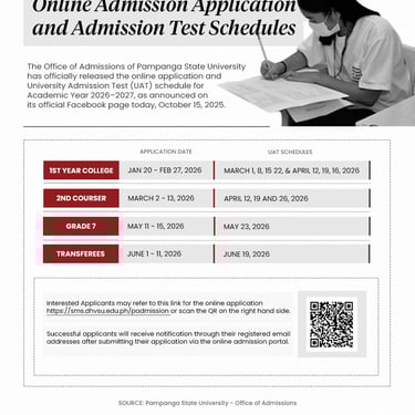 The Office of Admissions of Pampanga State University has released the online application and the University Admissions Test (UAT) schedule for the Academic Year 2026-2027, as announced in its official Facebook page on October 15.