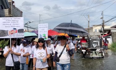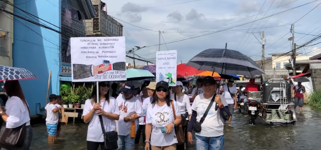 Matapang na sinuong ng mga residente ang baha sa kalsada ng Macabebe habang ibinabandera ang kanilang panawagan hinggil sa problema sa pagbaha sa kanilang bayan at sa malawakang korapsyon sa bansa, patungo sa San Nicolas de Tolentino Parish upang makilahok sa gaganaping Saingsing’s People Rally na sisimulan sa pamamagitan ng Banal na Misa ngayong araw, Oktubre 2.